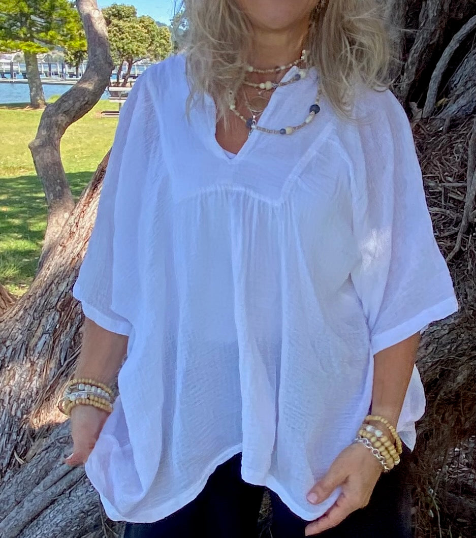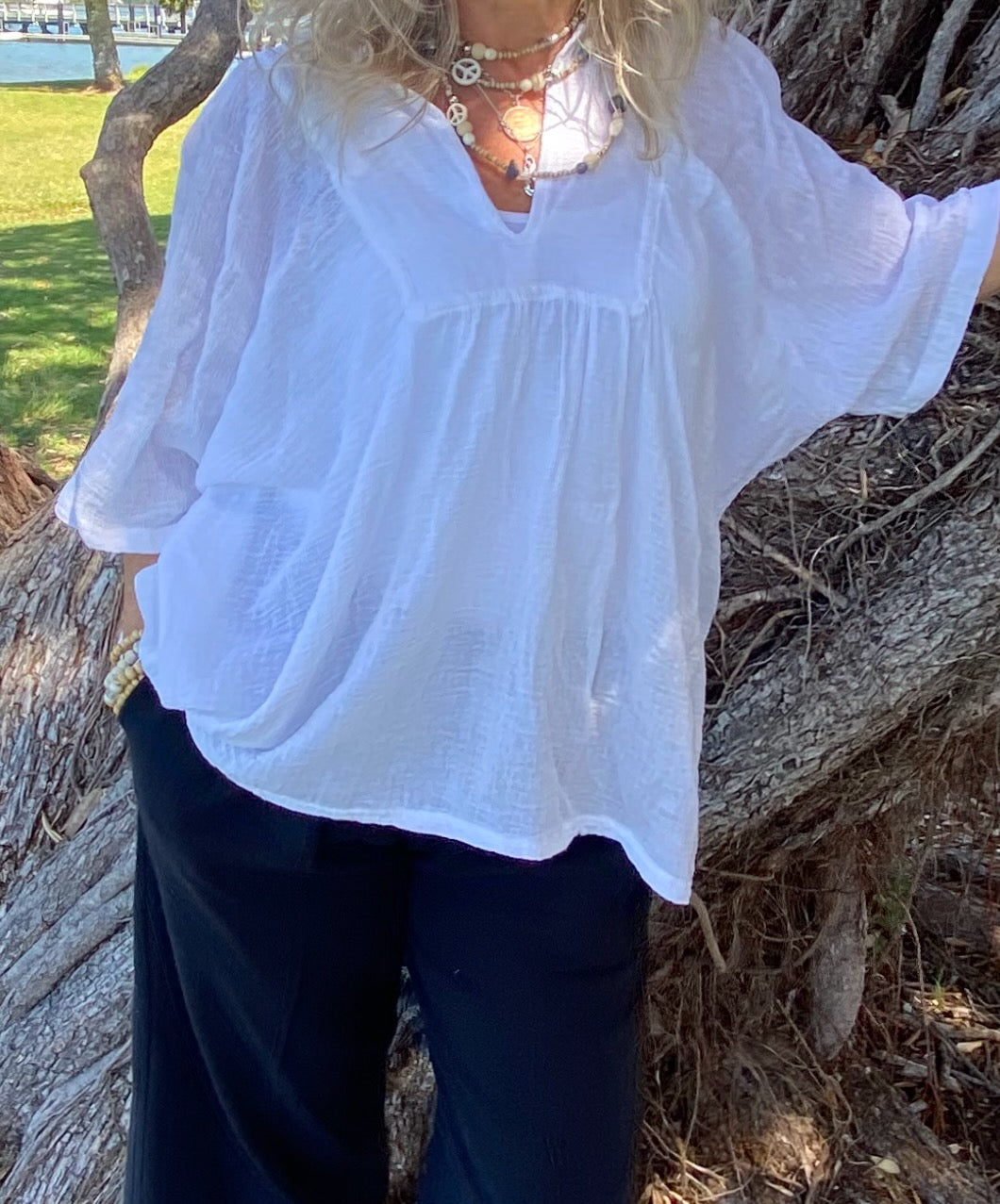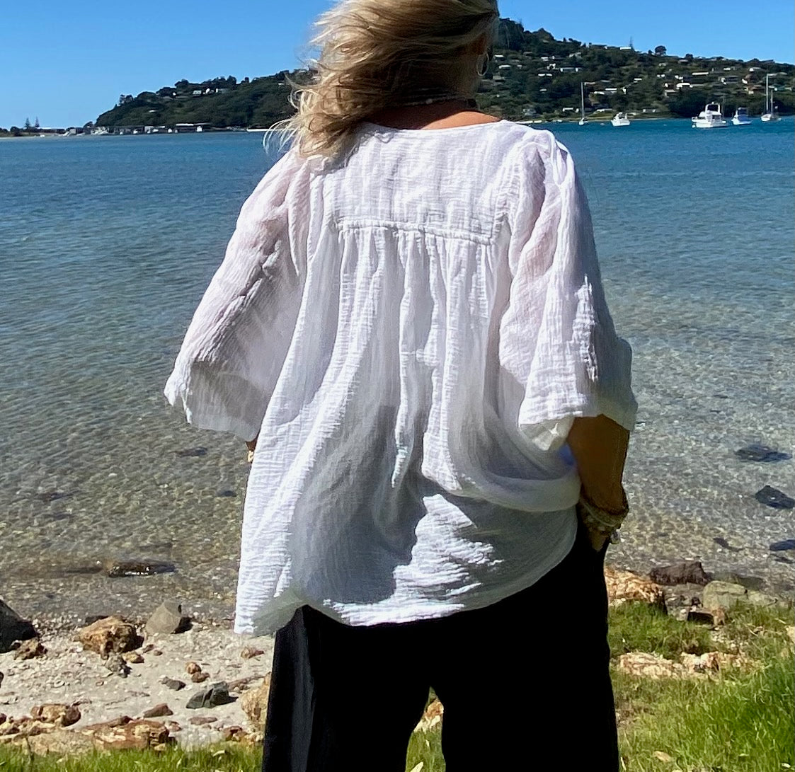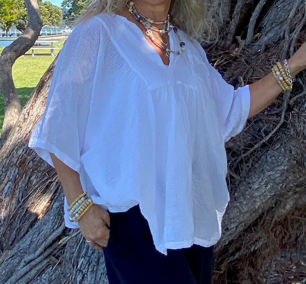 Our beautiful white ramie top adds a touch of elegance to any outfit. With its versatile design, it can easily be dressed up for a night out or dressed down for a casual day at the beach. The lightweight Boehmeria Nivea Ramie fabric and relaxed fit make it perfect for staying cool and comfortable in warmer weather. The delicate detailing and classic color make it a wardrobe staple . Pair it with denim shorts and sandals for a laid-back look, or dress it up with tailored pants and heels for a more polished ensemble. The possibilities are endless with this stunning top.Our Model is pairing her Ibu top with our Sukaah long pocket pants.