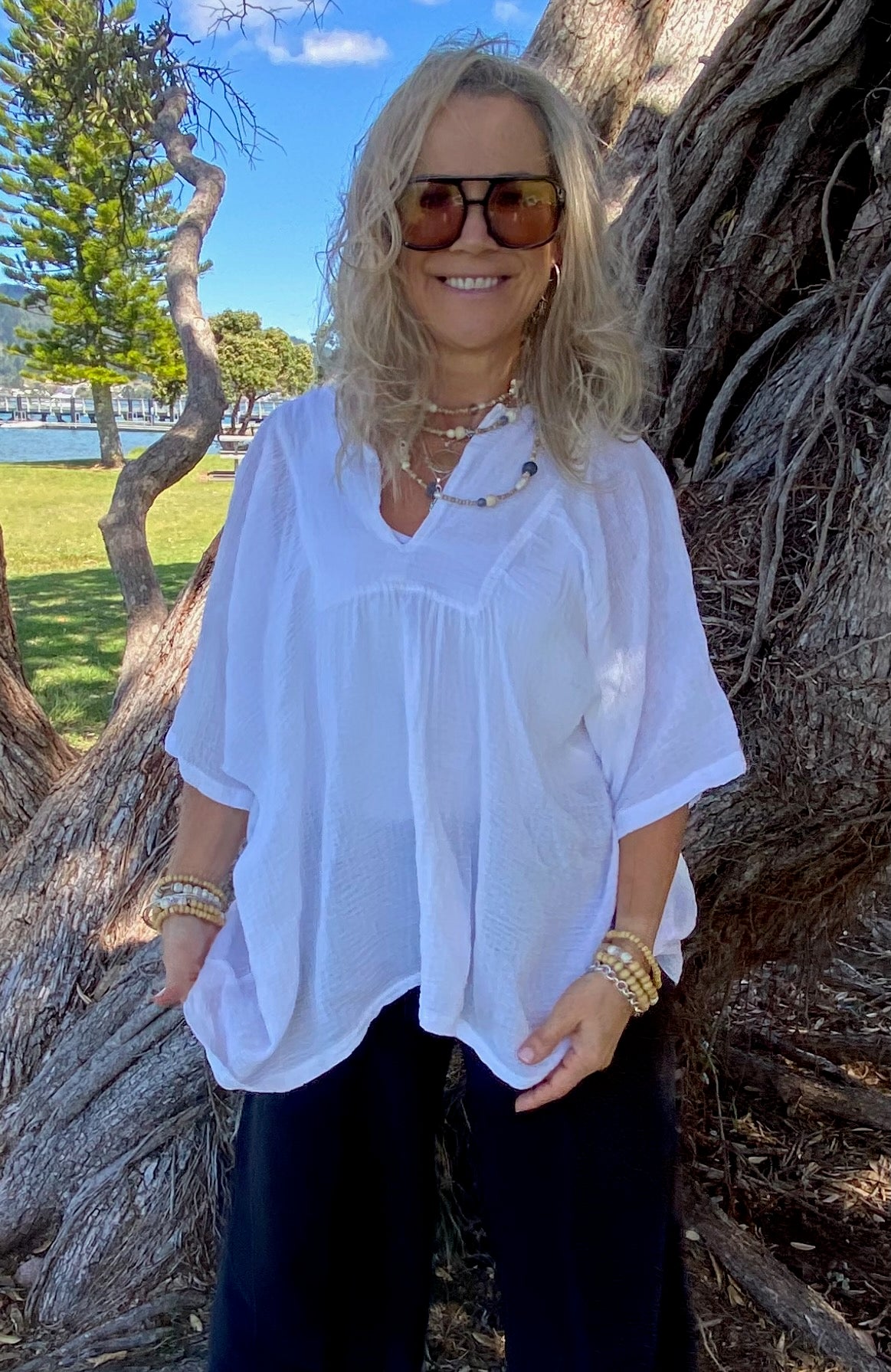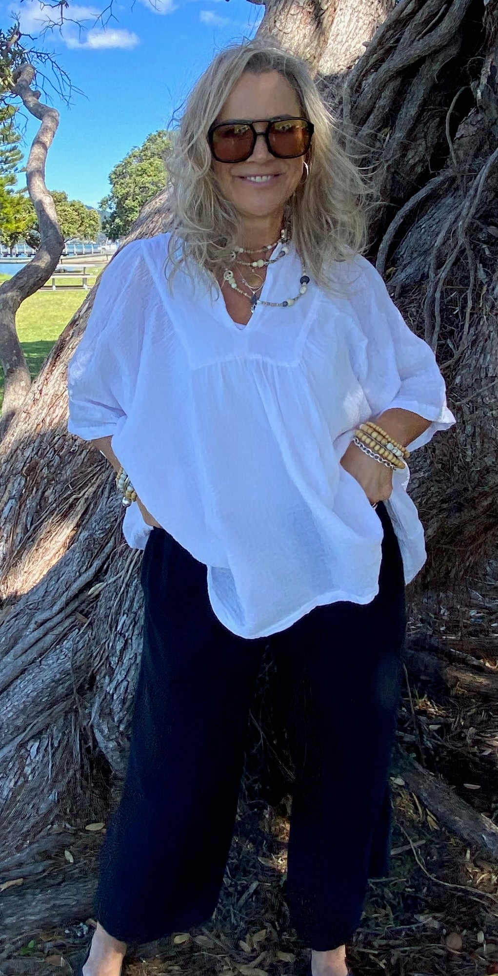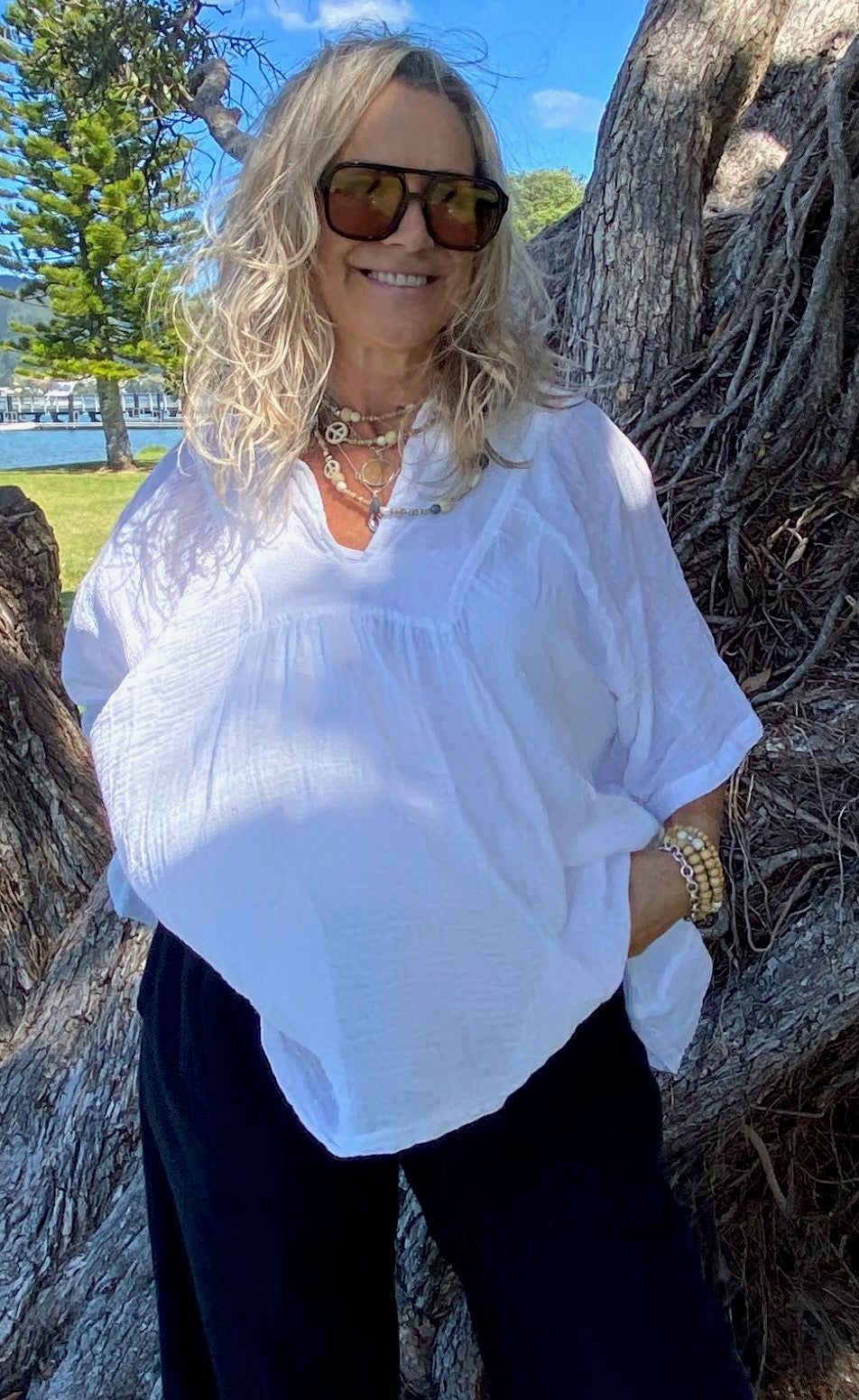 Our beautiful white ramie top adds a touch of elegance to any outfit. With its versatile design, it can easily be dressed up for a night out or dressed down for a casual day at the beach. The lightweight Boehmeria Nivea Ramie fabric and relaxed fit make it perfect for staying cool and comfortable in warmer weather. The delicate detailing and classic color make it a wardrobe staple . Pair it with denim shorts and sandals for a laid-back look, or dress it up with tailored pants and heels for a more polished ensemble. The possibilities are endless with this stunning top.Our Model is pairing her Ibu top with our Sukaah long pocket pants.